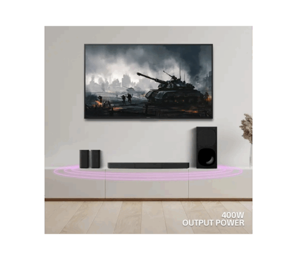 The system is rated for 400 W combined power output, and supports Dolby Digital decoding for cinematic audio reproduction. -